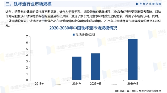 从产业带分布来看,浙江省金华市永康市堪称中国钛杯制造的核心枢纽。作为“中国五金之都”和“中国保温杯之都”,永康生产了全国近60%的保温杯。早在2016年,当地企业便开始探索钛材在杯壶产品上的应用,2018年即出现钛保温杯成品。据一财商学院调查,在所调研的60家永康保温杯工厂中,近一半已在供应钛保温杯产品。随着中国成为全球钛的主要生产国,海绵钛价格已从2006年的20万元/吨降至2023年的4至5万元/吨,显著拉低了钛杯的生产门槛。 在销售渠道方面,目前线下零售仍是主力渠道,占据约77%的市场份额,但随着直播电商和社交电商的兴起,线上销售渠道正在快速成长。在产品类型上,300-400ml容量段是当前最主流的细分品类,占据约50%的市场份额。 展望未来,全球钛杯行业有望保持强劲增长态势。在产品端,行业正朝着“健康化、轻量化、时尚化”方向演进,细分场景的精准适配成为产品创新的重要方向。在产能端,头部企业正加速产能扩张与海外布局,行业集中度有望进一步提升。在需求端,随着消费者对食品安全和健康饮水的持续关注,叠加环保意识增强带来的可重复使用产品趋势,钛杯的市场渗透空间依然广阔。 当然,行业发展也面临诸多挑战。钛杯的渗透率目前仍处于较低水平,据《2025天猫家居钛质餐厨器具趋势白皮书》显示,钛保温杯在中国市场的渗透率仅有约5%。此外,产品同质化问题日益突出,部分厂商为去库存采取了低价竞争策略,这在一定程度上影响了行业的健康发展。 总体来看,钛杯行业正处于从“小众高端”向“大众品质生活”加速渗透的关键阶段。随着技术迭代、成本下降以及消费认知的持续深化,钛杯有望在健康消费升级浪潮中迎来更广阔的发展空间。 |